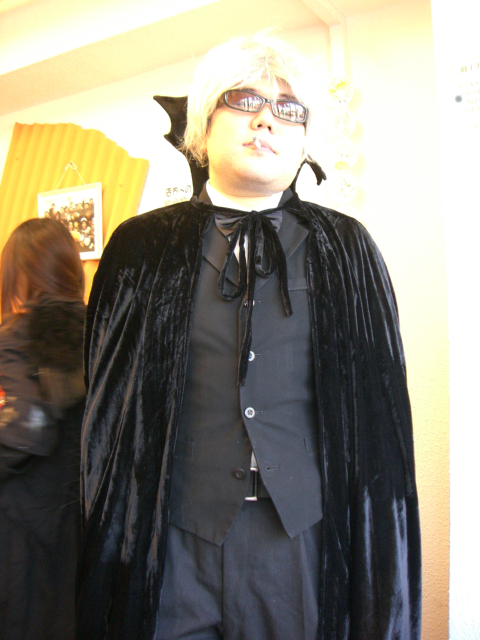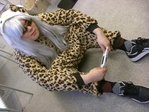本日男装イベントでございました。で、昨日の深夜とある常連仲間からメールがありまして、「男装には女装で応えるものだ」的なことをほんとにいきなり言われまして、慌てて午前中にドンキホーテでキティ(豹柄)の着ぐるみと銀髪のカツラ(超安物)と、リップグロスとアイシャドーを買ってイベントに挑んだわけです。
